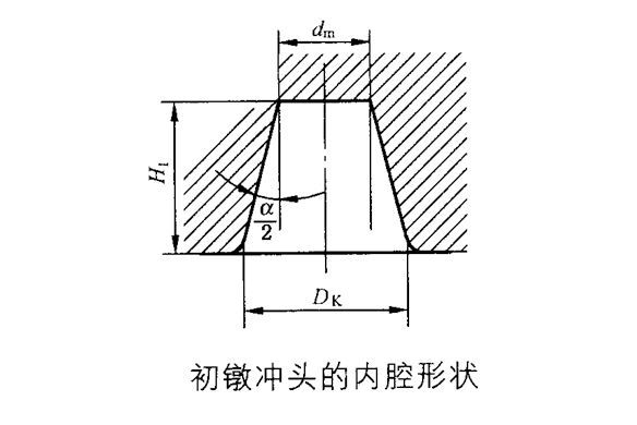 不帶彈簧頂桿的錐形沖模用于長桿工件的鐓制;帶彈簧頂桿的沖模用于桿部較短的工件。不帶彈簧頂桿初沖的錐形型腔錐角適當大一些,使工件容易脫離初鐓模,一般α取n8°~16°,初鐓沖頭的內(nèi)腔形狀,如圖。